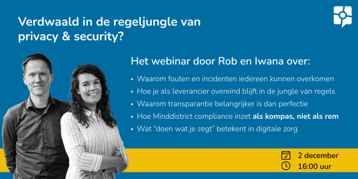 Geen juridisch college, maar eerlijke verhalen uit de praktijk. Als softwareleverancier in de zorg kun je niet om security en privacy heen. Maar wat mag er eigenlijk verwacht worden van een leverancier? En hoe houd je het menselijk én werkbaar? In dit webinar nemen Rob en Iwana je mee in hoe we bij Minddistrict omgaan met regels, risico’s en weerstand. | ![]() |