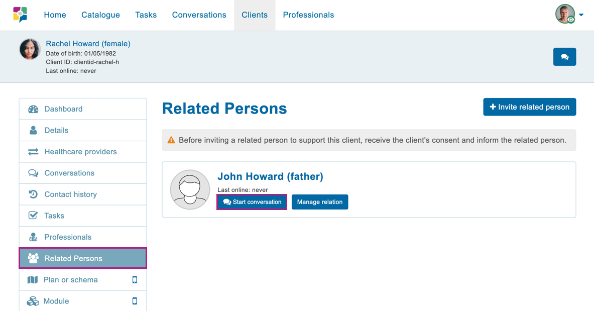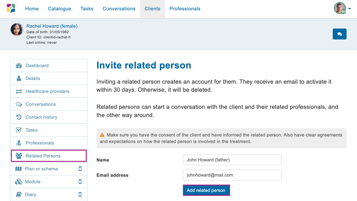 Met de uitgebreide functionaliteit kunnen nu ook hulpverleners en secretaresses een naaste van een cliënt uitnodigen. De naaste ontvangt vervolgens een e-mail met instructies om in te loggen op het account. Daarnaast kan de hulpverlener een gesprek starten met de naaste en ook de cliënt hierbij betrekken.